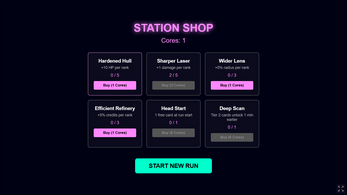 - Level up from collected resources and pick cards to build your run
