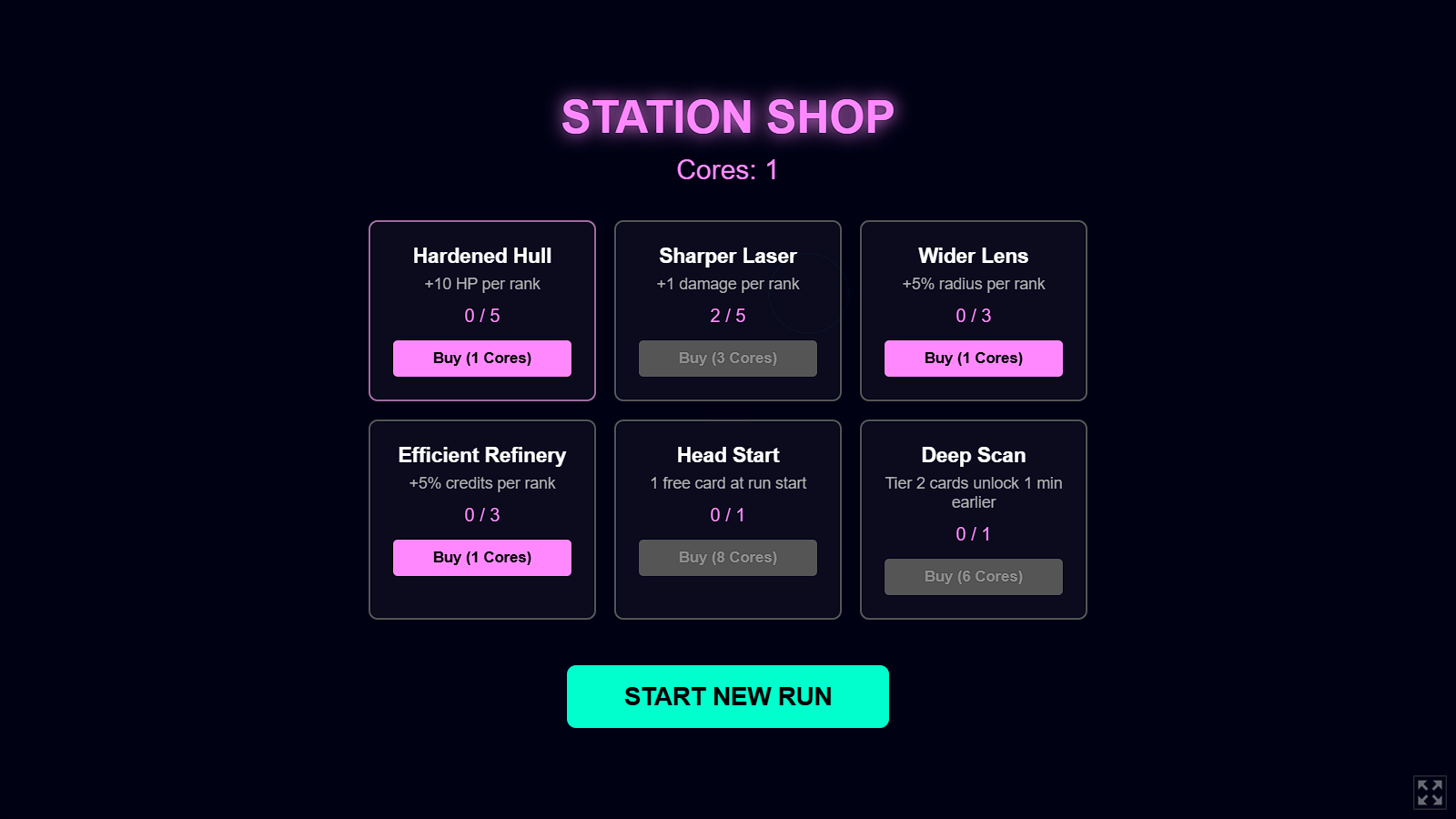 - Spend cores from boss kills on permanent upgrades between runs